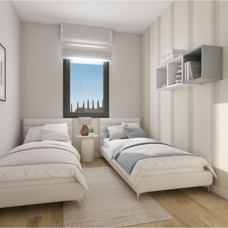 Descubre nuestros dormitorios diseñados para ser un refugio de paz y estilo. Cada espacio combina elegancia y funcionalidad, con grandes ventanales que inundan de luz natural, suelos de madera cálida y acabados modernos. Los tonos neutros invitan a la relajación, mientras que detalles únicos, como paredes acentuadas y armarios empotrados, añaden un toque de distinción. Imagina despertar en un lugar donde cada rincón ha sido pensado para tu comodidad y bienestar, convirtiendo tu hogar en el santuario que siempre has soñado. ¡Haz de tu dormitorio el corazón de tu nuevo hogar!