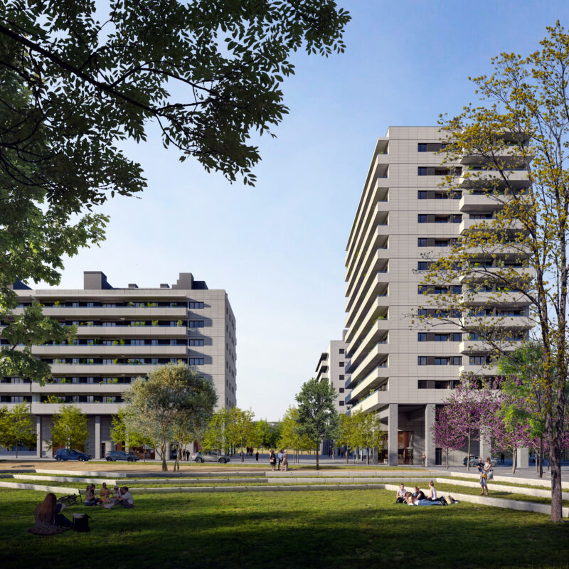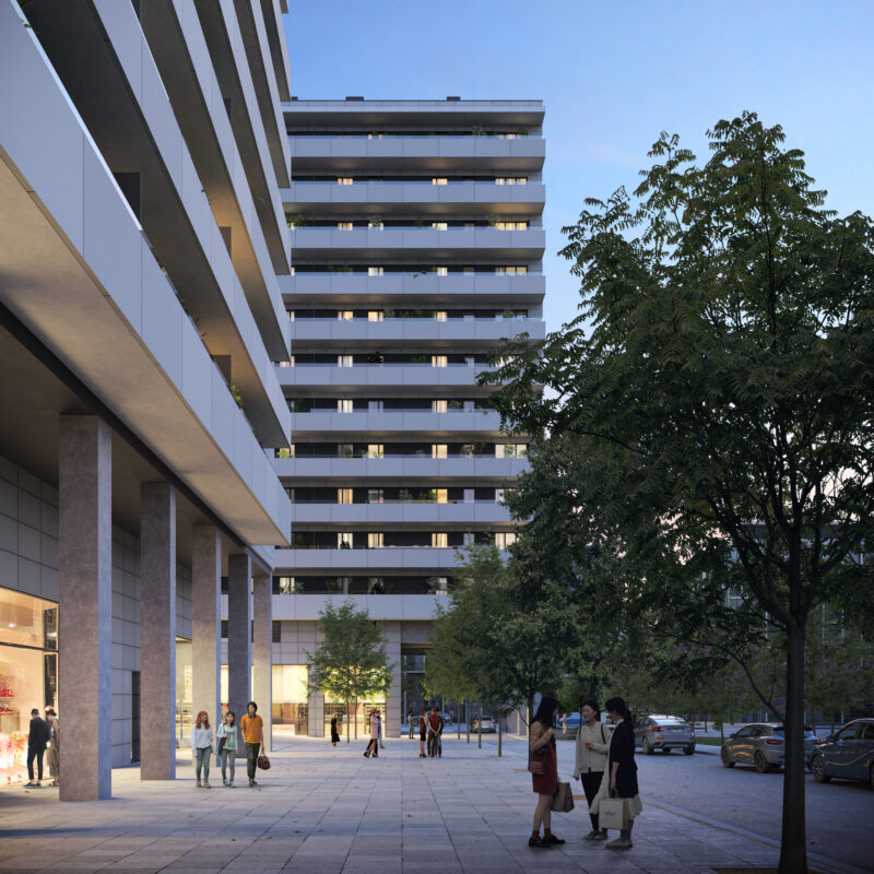 Conjunto residencial de 106 viviendas de 1, 2, 3 y 4 dormitorios, con garajes y locales comerciales.