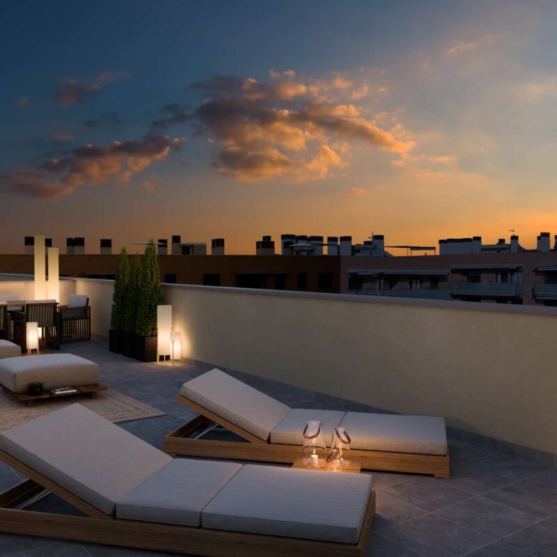 Disfruta de nuestras amplias terrazas, perfectas para relajarte y disfrutar del aire libre. Equipadas con cómodos espacios de descanso y vistas panorámicas, son ideales para desayunos soleados o cenas al atardecer. Este rincón privado se convierte en el escenario perfecto para momentos inolvidables con amigos y familiares. ¡Haz de tu terraza el refugio que siempre has deseado!